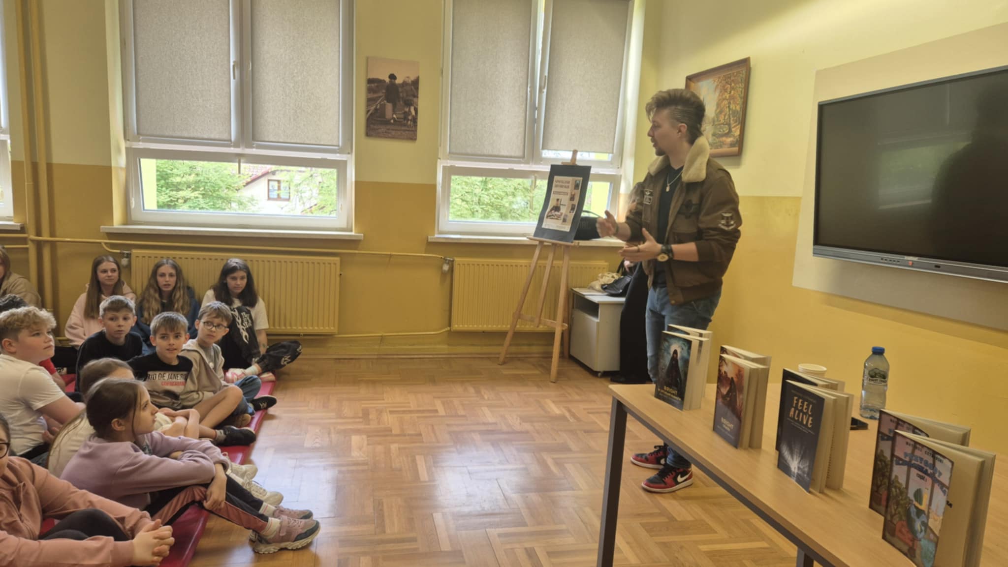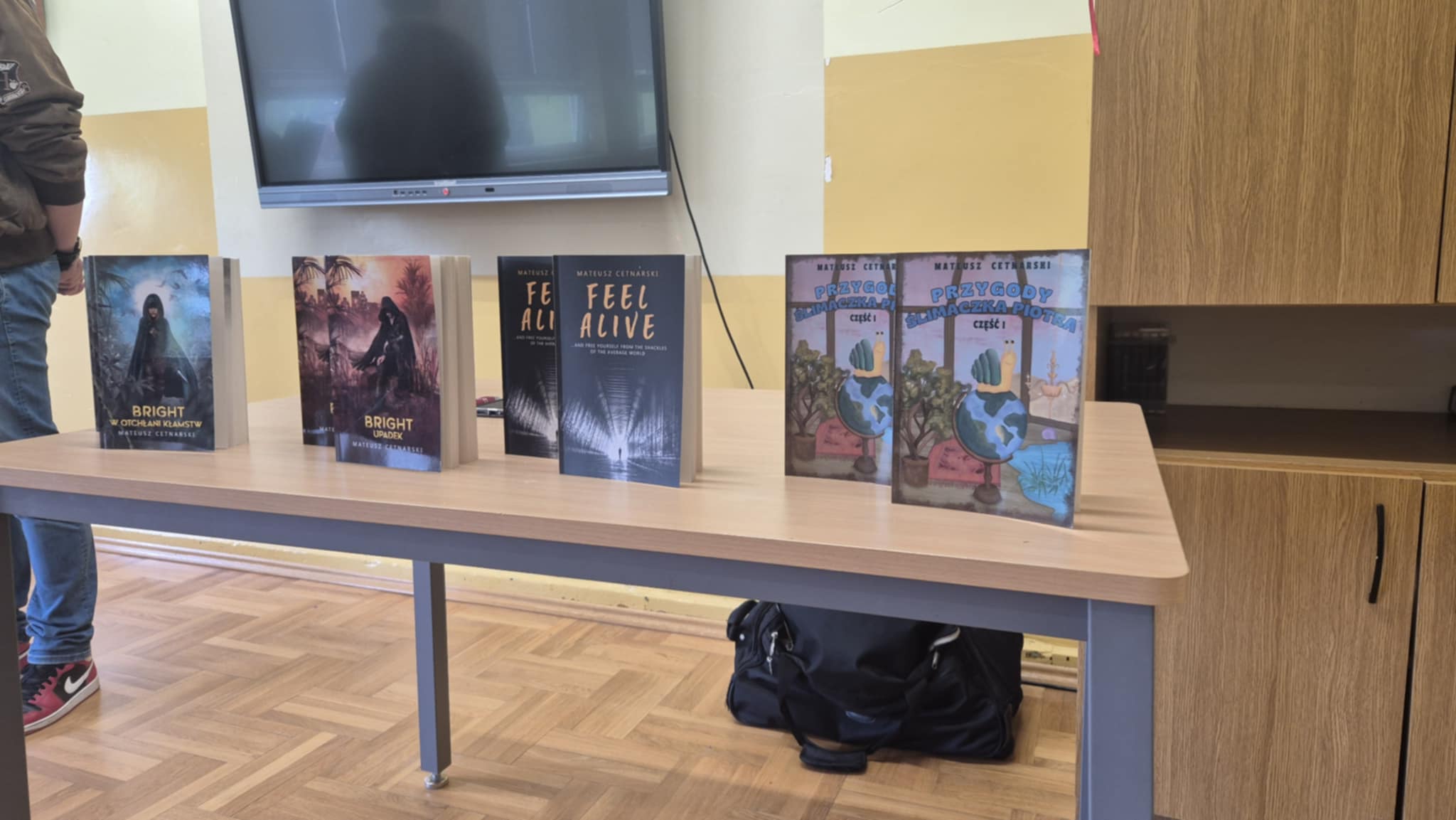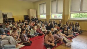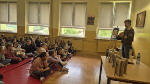 W dniu dzisiejszym uczniowie klas 4-8 uczestniczyli w spotkaniu autorskim z pisarzem Mateuszem Cetnarskim, autorem książki fantasy pt. „Bright W Otchłani Kłamstw”, którą napisał w wieku 13 lat a którą wydał w wieku 15 lat. Podczas spotkania autor opowiadał o swojej twórczości, inspiracjach oraz procesie powstawania książek a także dal pokaz tańca.